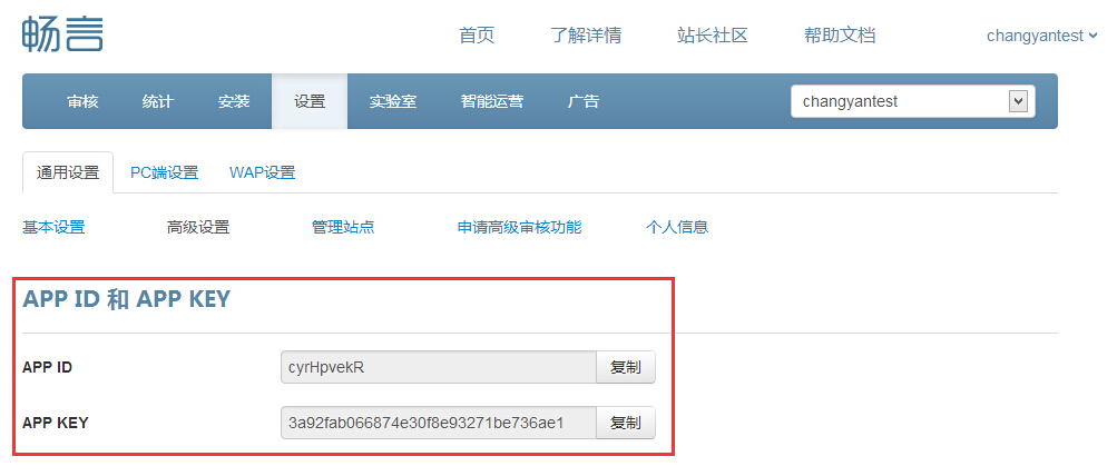 3、在后台-设置-通用设置-高级设置 中,获取您的appid和appkey。