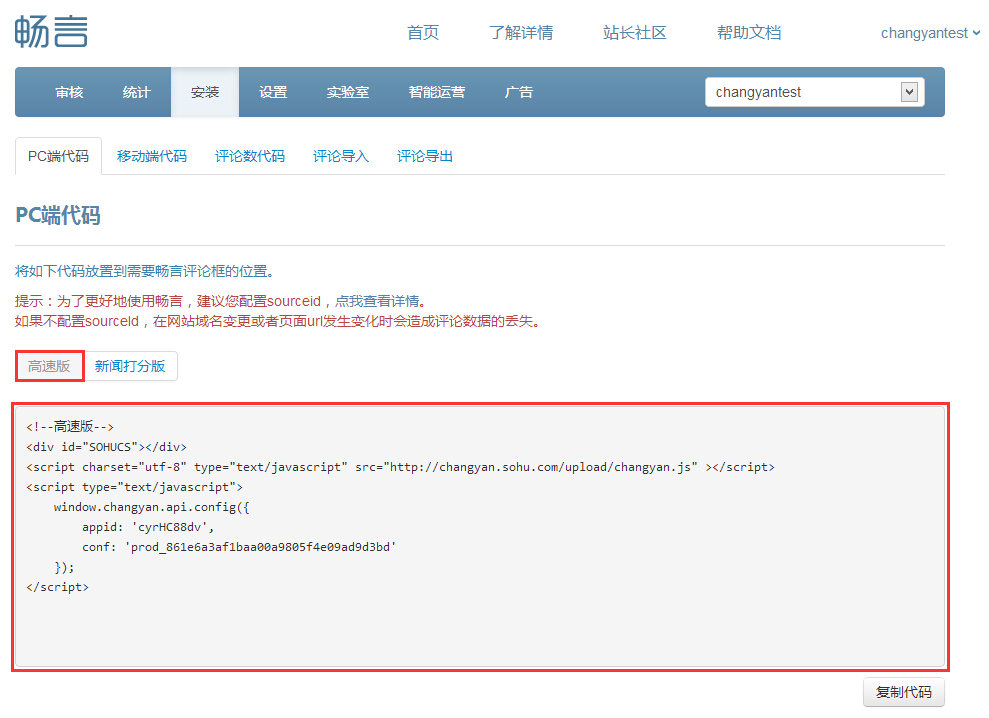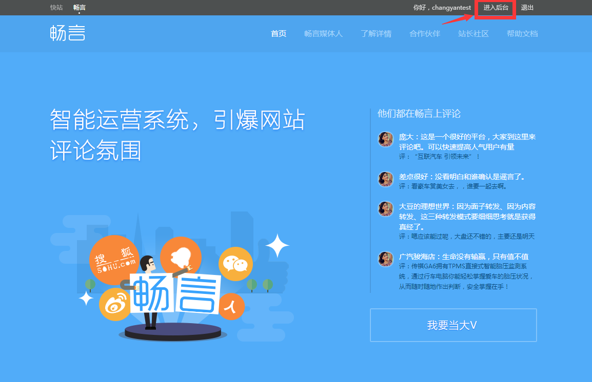 注册完成以后,回到云评论官网 http://changyan.kuaizhan.com,登录后进入云评论后台,如图:
